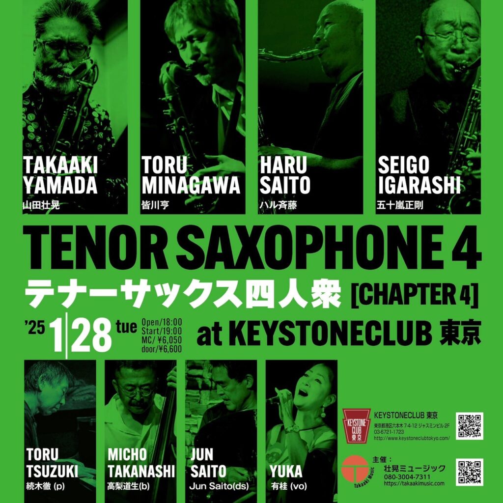 [2025.1.28] テナーサックス四人衆/CHAPTER4 at Keystone Club 東京 TITLEテナーサックス四人衆/CHAPTER4DATE2025.1.28 tueOpen 18:30 / Start 19:30MEMBER 山田壮晃(ts) 皆川 亨 (ts) ハル斉藤 (ts) 五十嵐正剛 (ts) 続木 徹(p) 高梨道生(b) ...