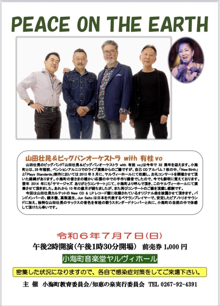 [2024.7.7]「Peace on the Earth 」 CD&LPレコード盤 絶賛発売中! 山田壮晃カルテットwith 有桂vo at ヤルヴィホール 山田壮晃カルテットによる「PEACE ON THE EARTH」を長野、ヤルヴィホールで開催します。北欧の雰囲気溢れる湖畔の音楽堂で、至高の...