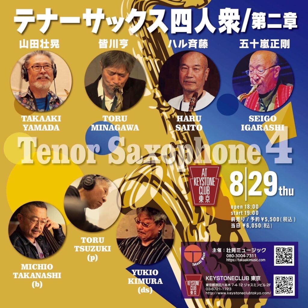 [2024.8.29] テナーサックス四人衆/第二章 at KEYSTONE CLUB 東京 TITLEテナーサックス四人衆/第二章DATE2024.8.29 thuOpen 18:30 / Start 19:30MEMBER 山田壮晃(ts) 皆川 亨 (ts) ハル斉藤 (ts) 五十嵐正剛 (ts) 続木 徹(p) 高梨道生(b) 木村...
