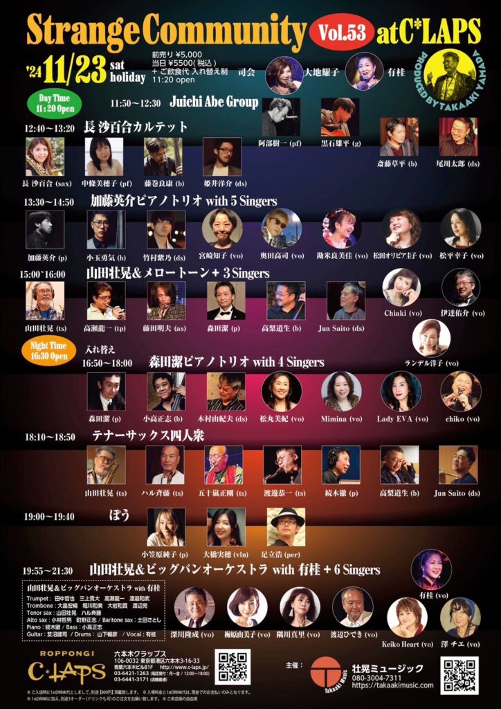 [2024.11.23] Strange Community Vol.53 at C*LAPS 今回も多くのアーティストが出演!ジャンルの垣根を越えて唯一無二のサウンドを奏でます。第53回目は六本木クラップスへぜひお越しください。 TITLEStrange Community Vol.53 at C*LAPSDATE & SHOWTIM...